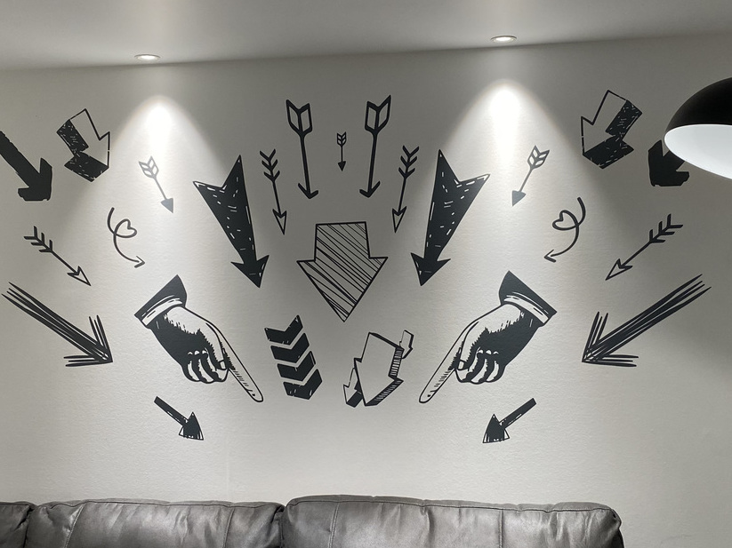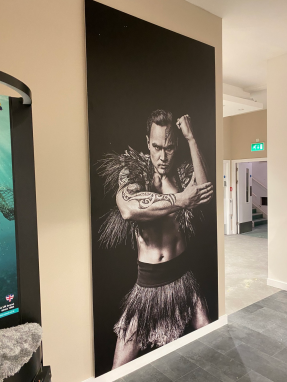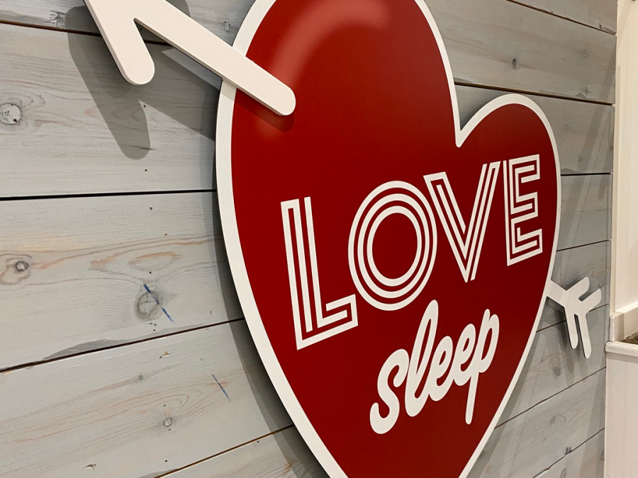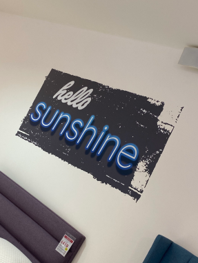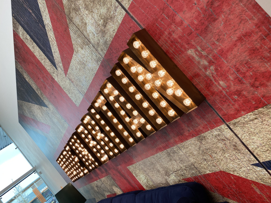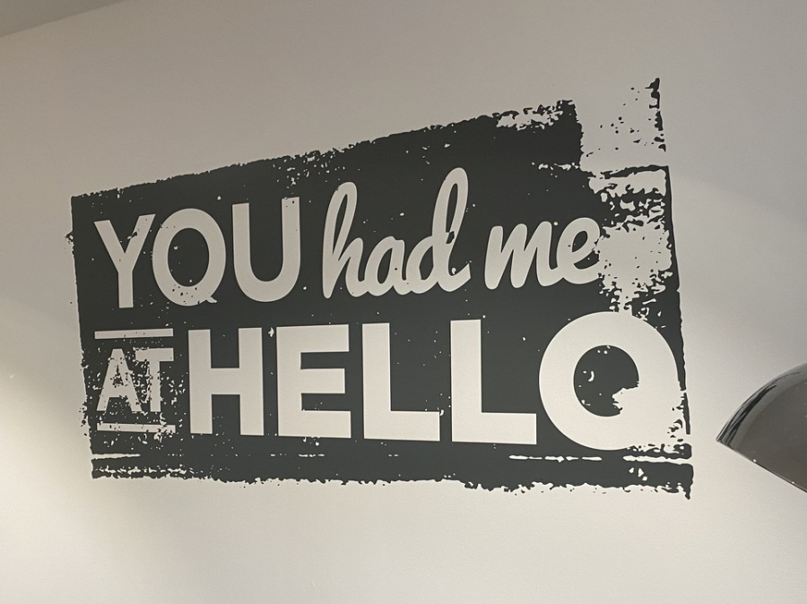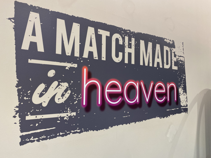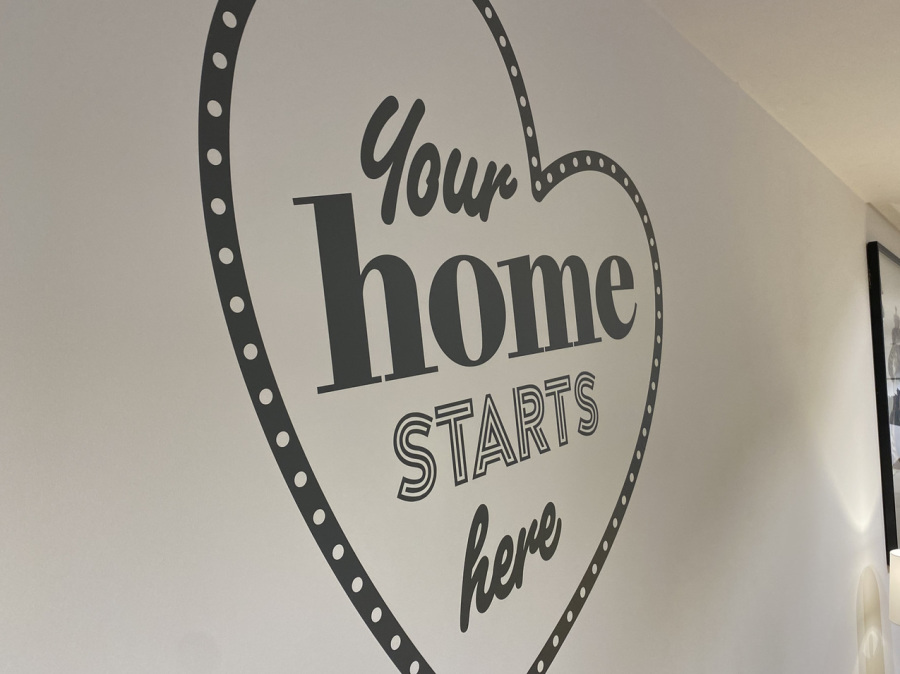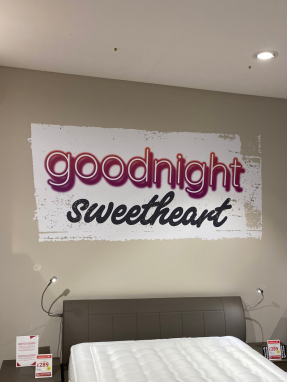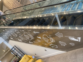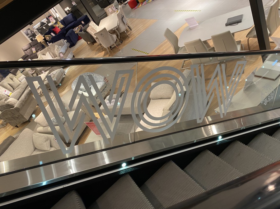 high level cut vinyl graphics, fret cut aluminium composite stand-off wall boards, fret cut foam lettering in LED illuminated troughs and glazing graphics to stairwells and escalators.
